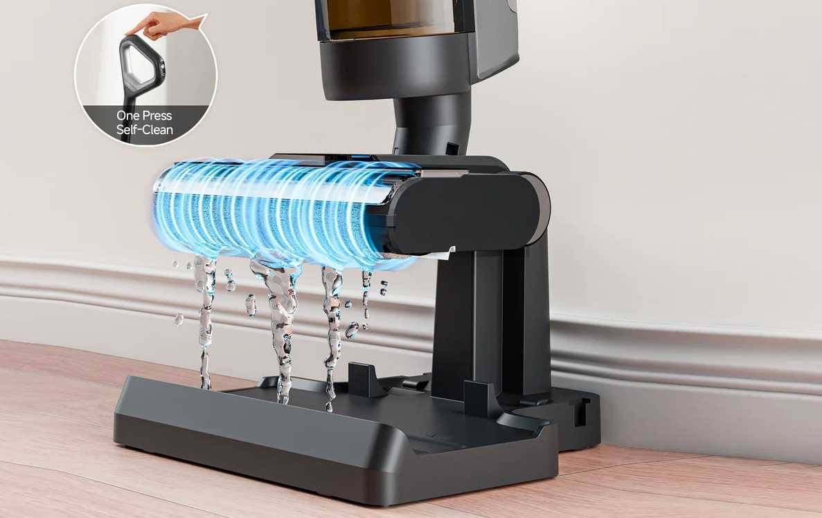 В комплекте — роликовая турбощётка с подсветкой, которая помогает видеть пыль даже в тёмных местах. Пылесос поддерживает влажную уборку: резервуар на 0,9 л позволяет протирать полы, не оставляя разводов.