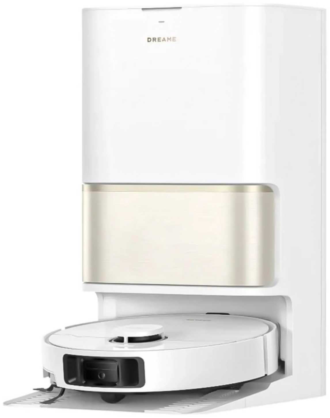 Dreame L50 Ultra CE сочетает мощную сухую и влажную уборку с интеллектуальной навигацией. Белый корпус с золотистыми акцентами подчеркивает премиальный стиль устройства.
